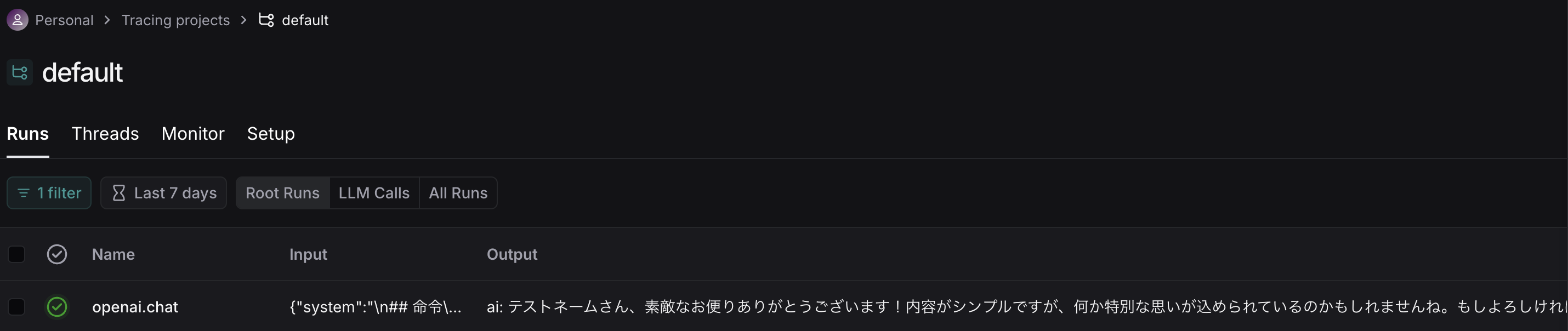 LANGCHAIN_ENDPOINT="https://api.smith.langchain.com"これで、LangSmith上にトレーシングできるようになる