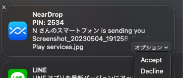 選択すると、Mac側にプッシュ通知が届くので、オプションから「Accept」をクリックすればシェア完了