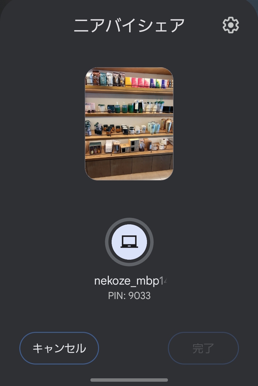 インストール&起動後、Androidスマホからファイル共有時にニアバイシェアを選択すると、自分のMacの端末名がニアバイシェアの候補に出現する。